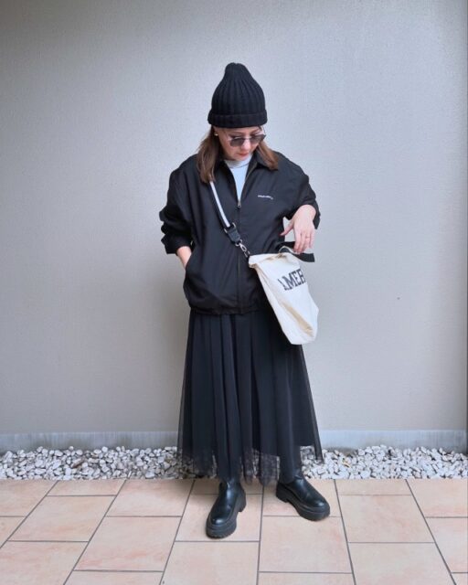 旬のスポーティアイテム×甘めアイテムのコーデは50代もぜひ取り入れてみましょう。軽快な黒のジップジャケットにチュールスカートを合わせれば、今っぽくて大人に馴染むスタイルに。足元をブーツで引き締めると全体のバランスがすっきり整います。