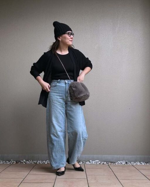 ゆっくり語らう女子会ならデニムパンツでリラクシーに。例えば黒のカーディガンとインナーでシックにまとめながら、ニットキャップで遊び心をプラス。アクセサリーのようなファーバッグを加えれば、仲間からの注目度も抜群です。