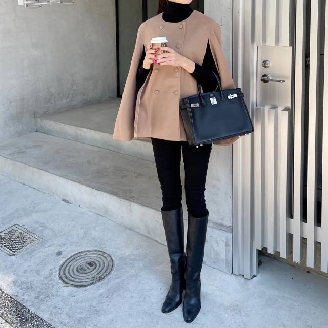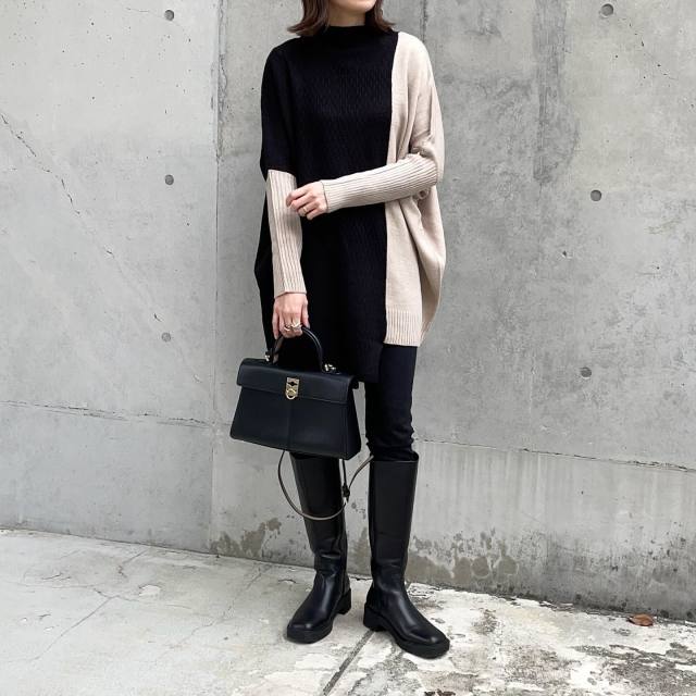 黒のロングブーツには「黒スキニーパンツ」が最適。ぴったりとしたパンツとロングブーツが馴染んでスタイルアップに効果を発揮。お尻がすっぽり隠れる丈感のニットやアウターを合わせるとコーデバランスも整います。