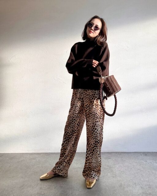 柄のおすすめはレオパード柄。ニットのブラウンと色味が近く、自然に馴染むから挑戦しやすいですよ。足元にゴールドのパンプスでキラメキを添えればグッと華やかな印象に。