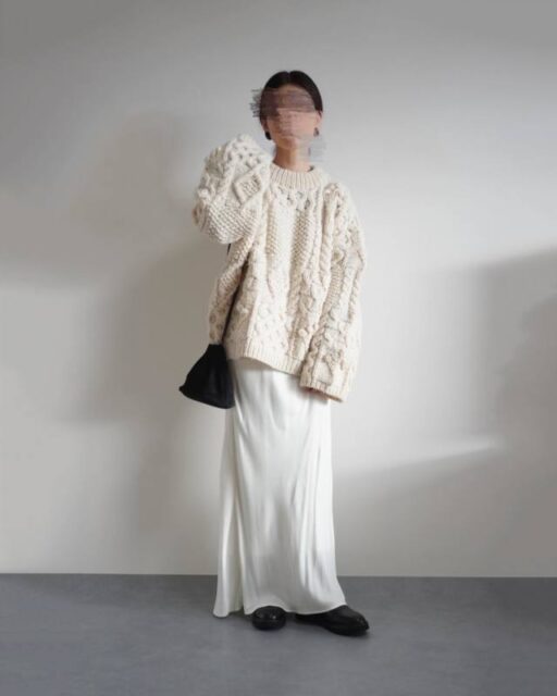 ざっくりとした風合いのホワイトニットに白のマキシ丈スカートを合わせたオールホワイトコーデは、まさにクリスマス気分を高めるスタイル。ニットにボリュームがあるから、ボトムはIラインの落ち感素材を選ぶのがバランスよく仕上げるコツです。