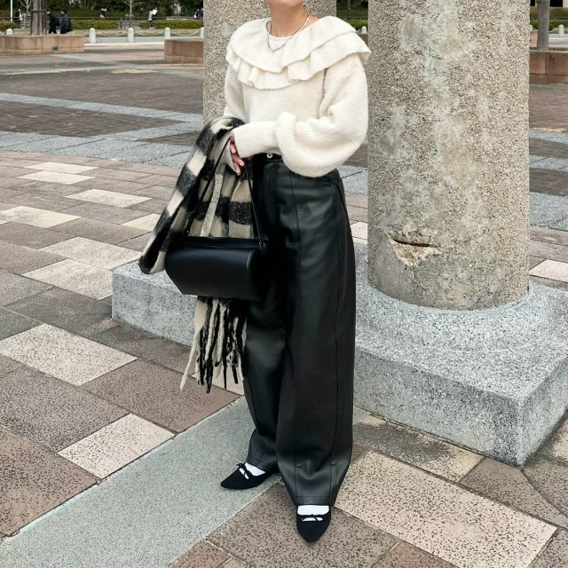 【クリスマスパーティーの服装4】フリルニット×レザーパンツで甘辛に