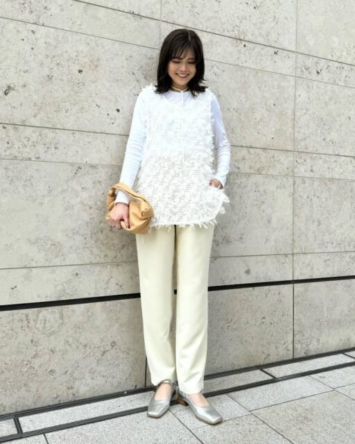 白ニットをオールホワイトでまとめると着膨れしそう……、そんなときこそ黒い靴がお役立ち。足元の黒色がコーデを引き締めて膨張感を解消。白ニット独特のほっこり見えも払拭します。