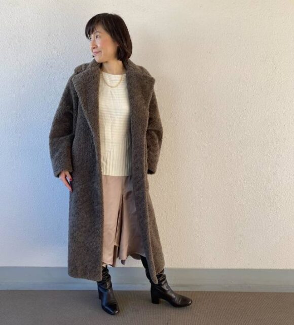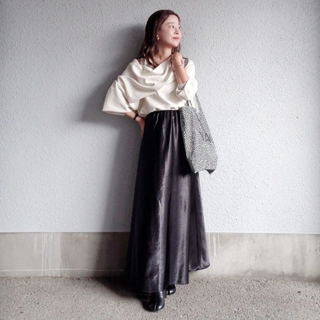 つややかでドレープが効いたスカートはエレガントなムードたっぷり。40代50代に馴染み、手持ちのニットやアウターに合わせるだけでコーデが華やぎますよ。