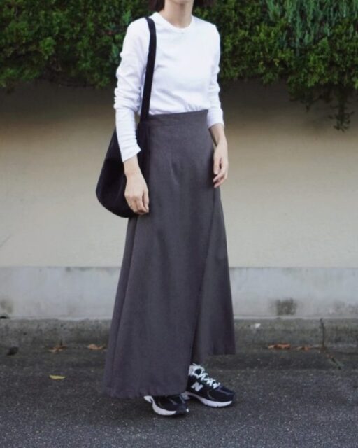 こちらではプルオーバー×ロングスカートのスタンダードな組み合わせにNew Balance(ニューバランス)の黒スニーカーを投入。シンプルな装いの中で、スニーカーの「N」のロゴがさりげなくスタイリッシュに映えます。