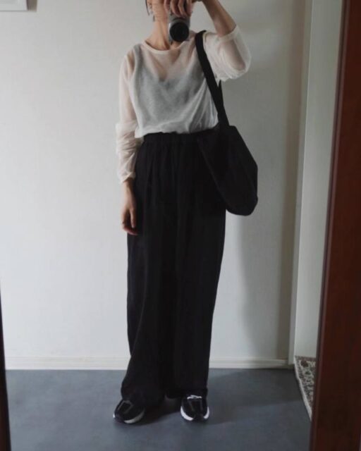 コーデをキュッと引き締め、どんなスタイリングにもマッチするのが万能色である黒。シアーな白プルオーバー×黒ワイドパンツに黒スニーカーを合わせたミニマルなコーデは、シンプルながらどこかモードな佇まいです。こんな風にクリーンで洗練されたきれいめ感を保ちながら、程よくリラックスしたムードを添えられるのはNew Balance(ニューバランス)のスニーカーならでは。