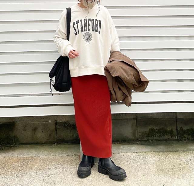 最後にご紹介するのは、素材やカラーリングで12月らしさを演出するカジュアルコーデ。今季のトレンドかつ冬っぽさを演出してくれるベロアのほか、クリスマスのイベントシーンを盛り上げるレッドカラーが特におすすめですよ。ちょっと派手見えしそうな素材や色でも、ボトムスで取り入れると意外とコーデはカンタン。ぜひ試してみてくださいね♪