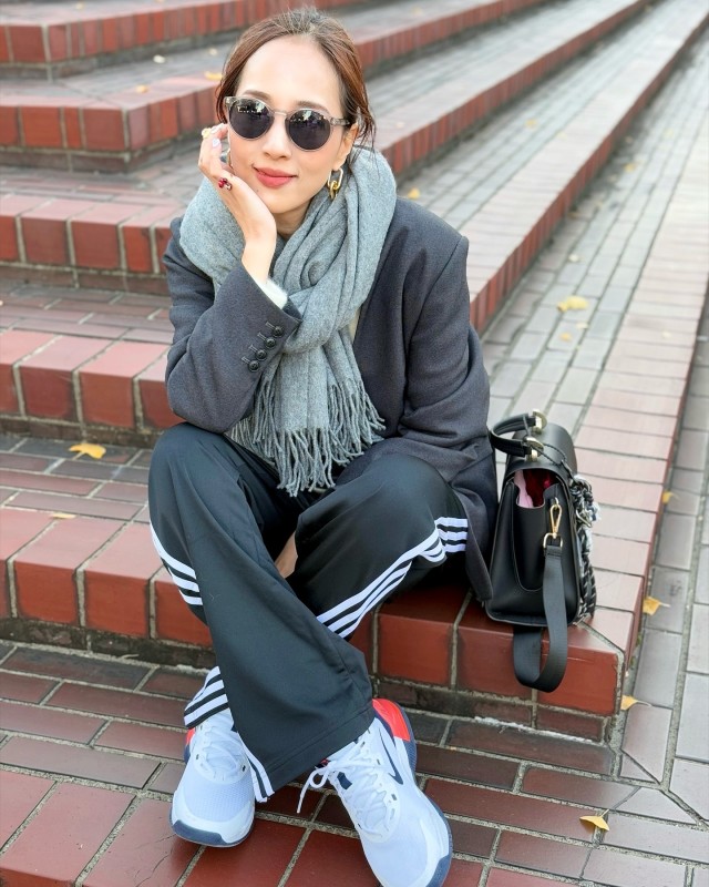 こちらは、ハンサムなジャケットアウターとカジュアルなトラックパンツを組み合わせたコーデ。異なるテイストのお洋服や小物をミックスすることで、40代の大人だからこそ似合う絶妙なバランスが完成! きれいめアイテムを織り交ぜることで、いつものカジュアル服の鮮度もアップしますよ。