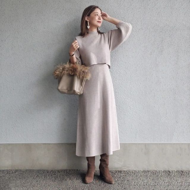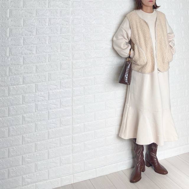茶色ロングブーツがより引き立つのが「アイボリー・オフホワイトのワンピース」とのコーデ。クリーミーな色のワンピースが温かみのあるブラウンブーツに映え、きれいめな装いに。長すぎない丈感のワンピースを合わせて、ブーツを強調するのが女性らしく着こなす秘けつです。