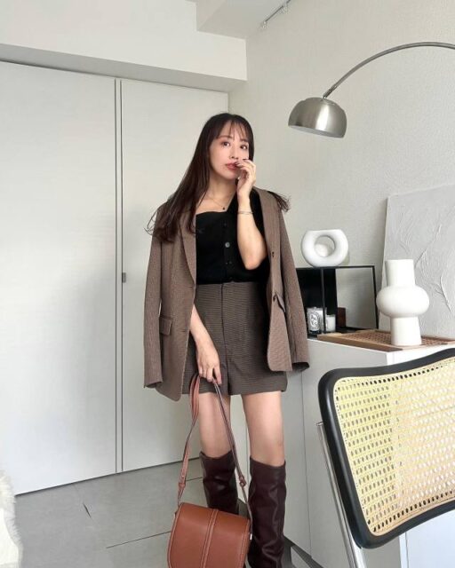 ロングブーツとショートパンツの組み合わせは難しく感じますが、茶色ロングブーツ×ブラウン系ショートパンツなら取り入れやすいですよ。というのも茶系は肌馴染みのいい色なので、脚出しスタイルが悪目立ちしません。ナチュラルにコーデしたいときは、黒ロングブーツとの合わせよりも茶色ロングブーツがおすすめ!