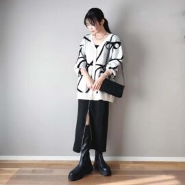 大人世代がショートムートンブーツを取り入れるときは、脚を出さないスタイリングがおすすめ。例えばゆったりめ&ロング丈のワンピースはボリュームがあるブーツと相性がよく、リラクシーなコーデが楽しめますよ。さらに足元の冷え対策にもうってつけです。