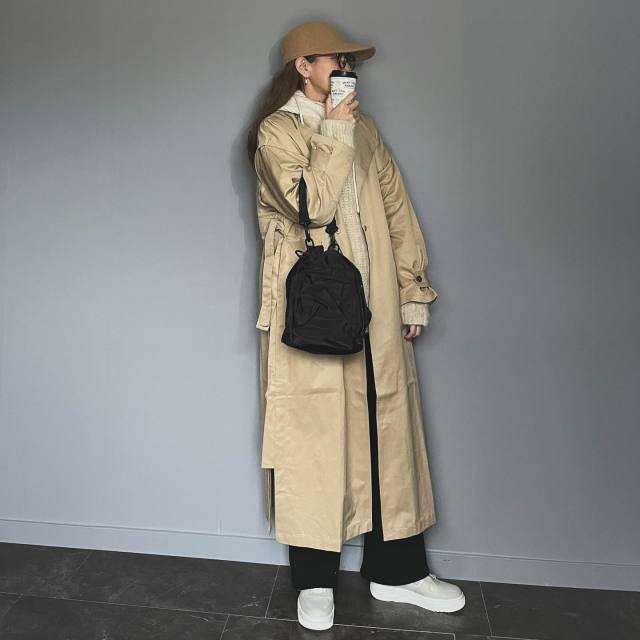 「ロングコート」をフレアパンツにガバッと羽織ればコーデ全体がスッキリします。コートからフレアパンツが覗き、縦長シルエットを強調。大人っぽくてスマートな装いに決まります。
