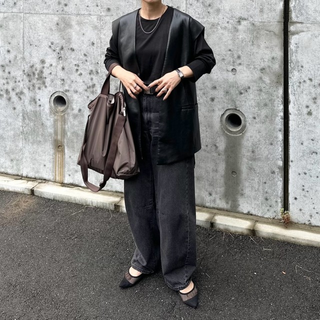 黒い服をメインにするときは、素材が違うアイテムを合わせるのがおすすめ。これだけでコーデの洗練度がアップします。スナップではレザー・カットソー・デニム・シアー素材と、同じ黒色でもさまざまな質感を取り入れることで、スタイリングに表情と奥行きをプラス。
