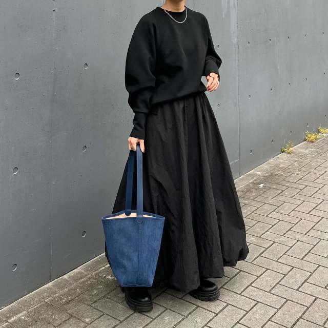 黒色はシックだからこそ、デザインやシルエットに華のあるアイテムを選ぶと一気にあか抜けた印象に。例えばスナップのような立体感のあるニットやボリュームスカートはおすすめ。オールブラックでまとめても重たく見えず、目を引くスタイリングを作ってくれます。