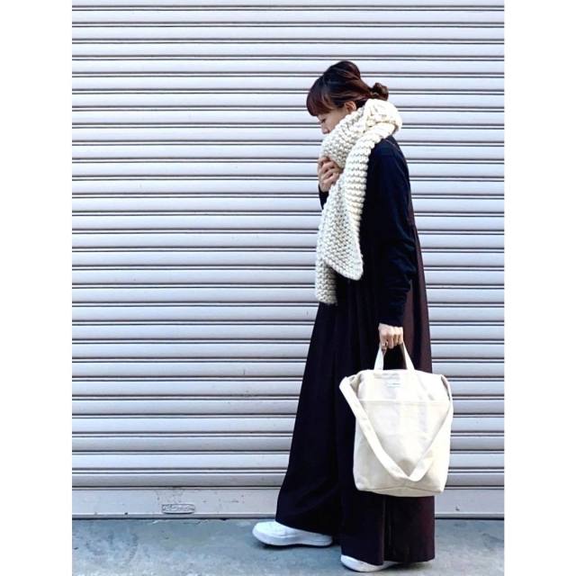 まずマフラーコーデをおしゃれに見せるには、合わせる洋服の色を意識するのがコツ。白のマフラーに似合うのが「黒っぽいコーデ」です。チャコールグレー・ネイビー・ダークブラウンなど、黒っぽい濃色であればOK。白のマフラーをサッと巻くだけで、沈みがちなダークカラーコーデが明るくなりますよ。