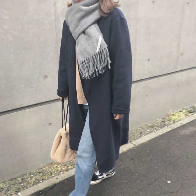グレーのマフラーは無難なイメージ。だからこそデニムコーデに合わせるマフラーとしてお役立ちです。インディゴデニムやブルーデニムなど青系デニムがスモーキーなグレーマフラーに馴染み、シックな印象に。ここにダークカラーのアウターを羽織ると大人っぽく締まりますよ。