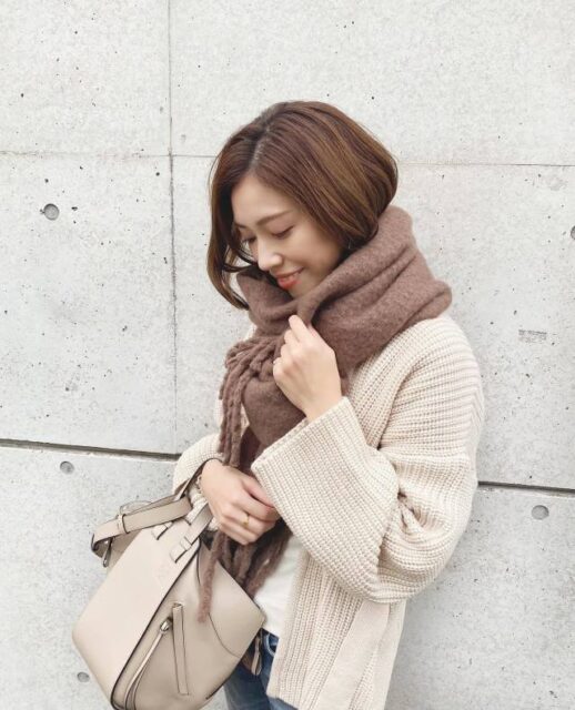いま人気のブラウン・ベージュ色のマフラーに最適なのが「同系色コーデ」。柔らかな雰囲気が高まり全身が品よくまとまります。