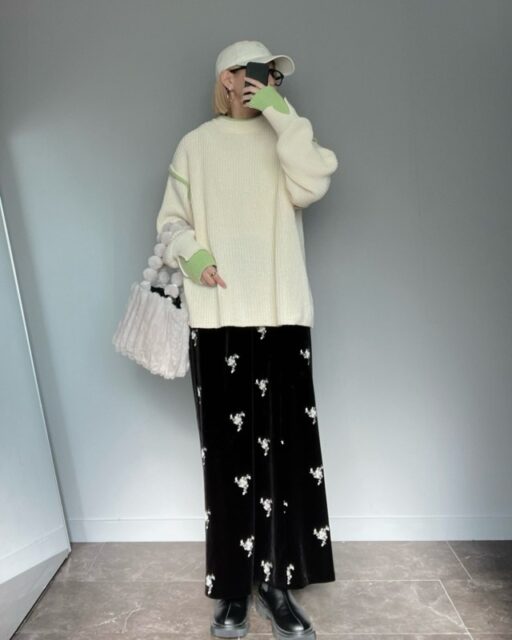 スナップで着用しているスカートは>>Aunt Marie’s(アントマリーズ)「フラワー刺繍ベロアナロースカート」