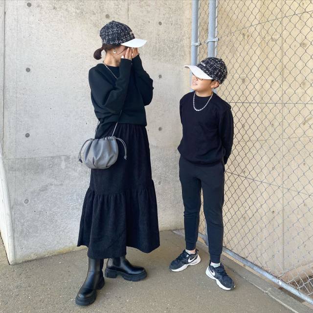 三つ目にご紹介するのは、モノトーンアイテムで統一した男の子との親子リンクコーデ。ベーシックな黒は親子で色を揃えやすく、クールなリンクコーデを楽しめますよ。スナップでは、お揃いのキャップを使ってよりリンク感をアップ♪