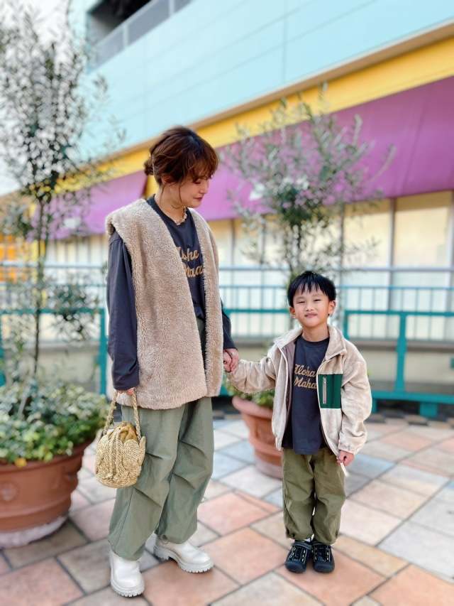 こちらは、ベージュのもこもこ素材とカーキパンツで作った親子リンクコーデ。まったく同じアイテムでなくても、色や素材感を統一することで親子リンク感が出せるんです。また、カーキパンツは男女ユニセックスで着やすいアイテムなので、男の子ママのリンクコーデで大活躍してくれますよ。