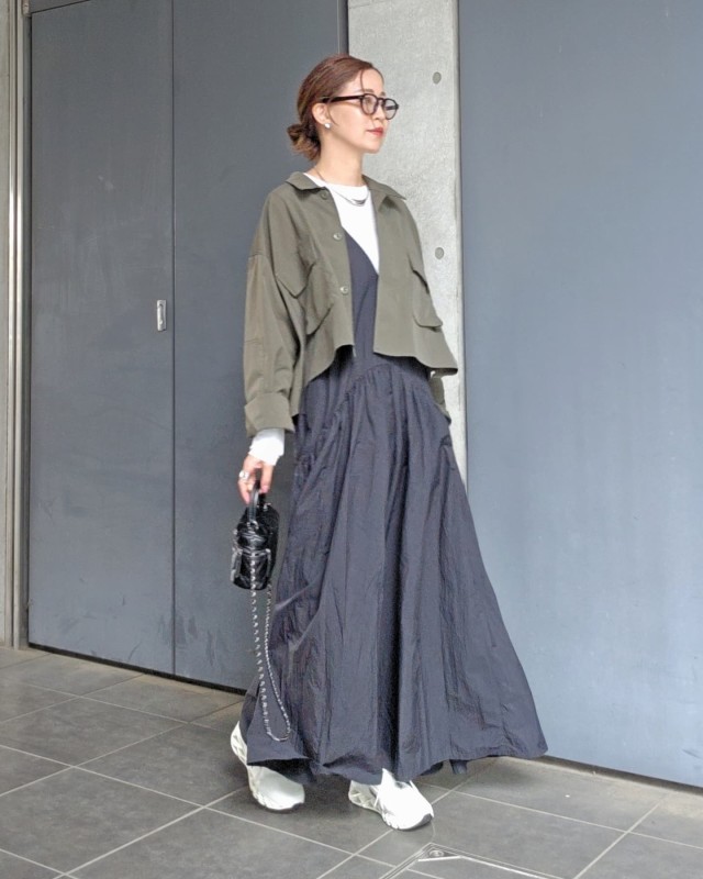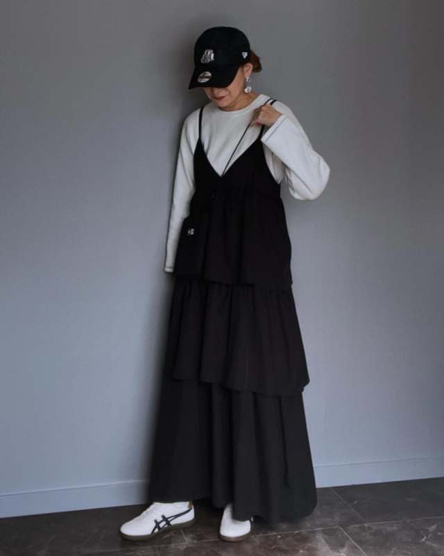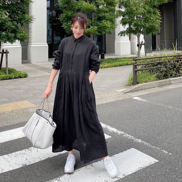 黒ワンピース×白スニーカーのコーデ