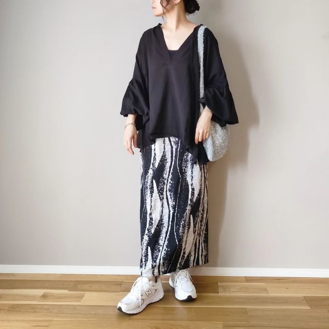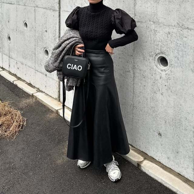 黒スカート×白スニーカーのコーデ