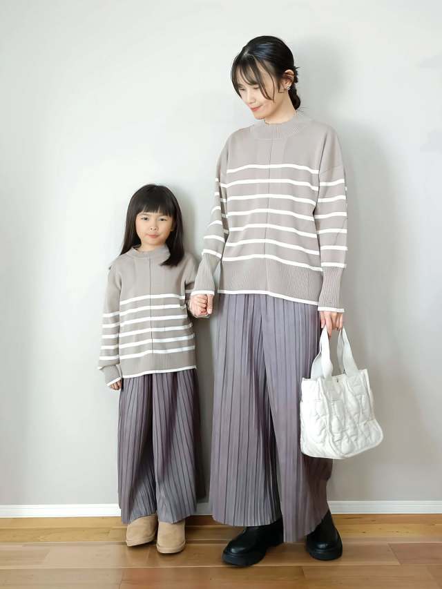 まずご紹介するのは、ikka(イッカ)のトップスを使った親子リンクコーデ。スナップでは、ベージュベースのボーダーニットをお揃いで着用しています。簡単にリンクしやすいボーダー柄ですが、なかなかバッチリ同じデザインのものは見つけづらいもの。でもikkaなら、大人サイズとキッズサイズでお揃いデザインが見つかりますよ。