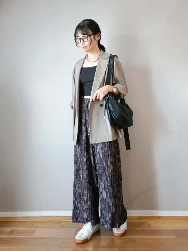 こちらは、ikkaの柄プリーツパンツを使った着こなし。ジャケットスタイルになじませれば、スタイリッシュなママコーデの完成です。