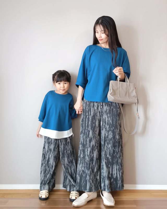 次にご紹介するのは、ikka(イッカ)のお揃いボトムスを使った親子リンクコーデ。スナップでは、グレートーンの大人っぽい柄がおしゃれなプリーツパンツをお揃いに。ママも着こなしやすいスタイリッシュなデザインだから、気軽に親子リンクコーデが楽しめますね。