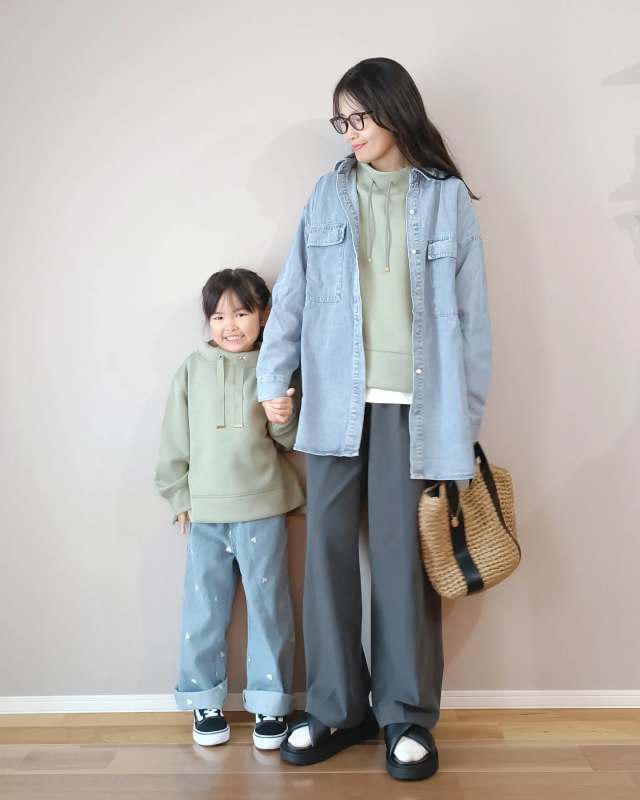 こちらは、ペールトーンがおしゃれなスウェットトップスがikka(イッカ)のリンク服。ママはデニムシャツ、お子さんはデニムパンツと、素材感も一緒にリンクしたスタイリングアイデアがとっても可愛いですね♪