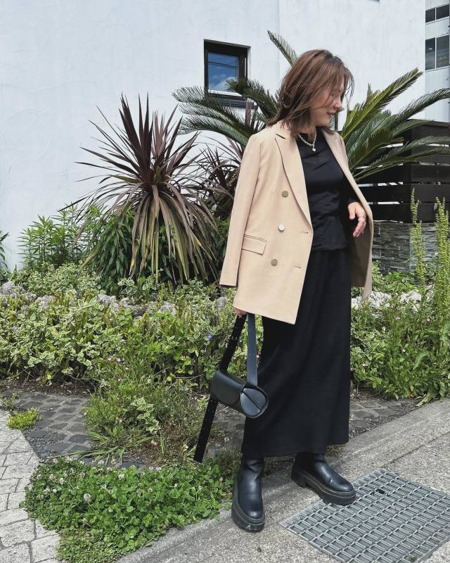 テーラードジャケットを使ったきれいめな着こなしでは、「足元だけカジュアル」を実践すると今っぽいこなれ感を演出することができます。例えばスナップでは、足元に厚底ブーツを合わせてカジュアルさをプラス。インナーをオールブラックでまとめて、モードさも感じるおしゃれコーデに。
