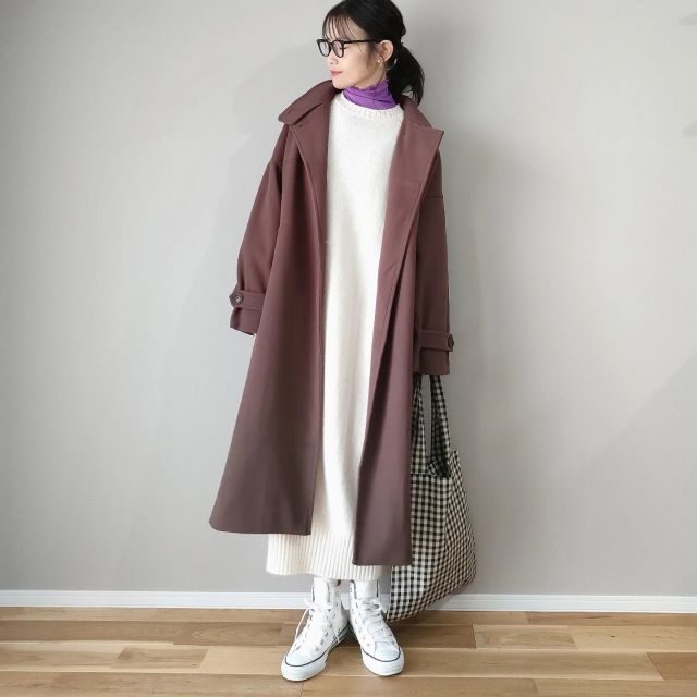 ロングコートを羽織るだけでコーデの縦長シルエットを強調して、スッキリ見え。このときコートより長い丈のワンピースを選ぶと立体感が生まれ、レイヤードがのっぺり見えません。