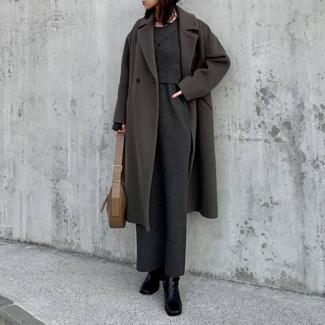 ロングコートを着るときは、コーデ全体が重たくならないようスタイリングするのがコツ。テクニック不要でおしゃれに決まるのが「Iラインのロングワンピース」との着合わせです。