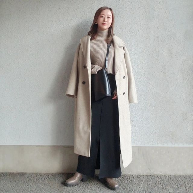 ロングコートに重量感のあるボトムを合わせるときは、「ロングコートに近い色」を選ぶのがおしゃれへの近道。例えばロング丈のティアードスカートやワイドパンツなどボリュームがあるデザインでも、コートの色と似ていれば大丈夫。ロングコートとボトムの色味が溶け込み、コーデの重さを感じさせません。