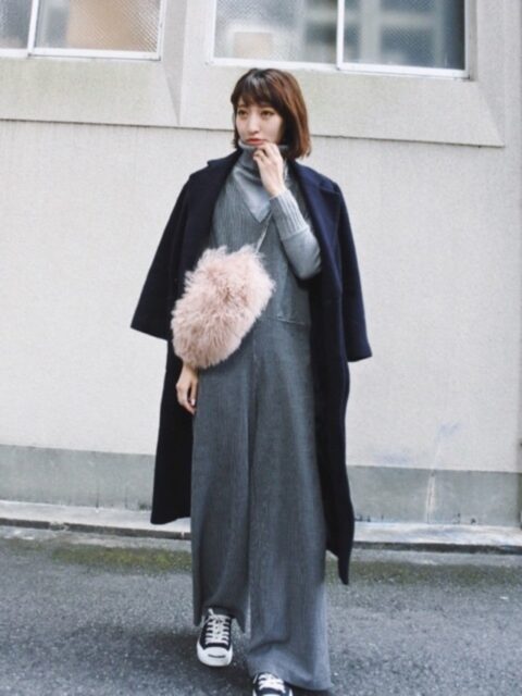 上下が繋がった「オールインワン・サロペット・ジャンパースカート」もロングコートにぴったり。インナーにタートルネックニット・ハイネックニットを選ぶと、襟高ネックが効いて背がスラリと高く見える効果が期待できますよ。