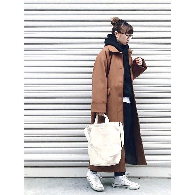 ロングコートコーデをおしゃれにハズしてくれるのが「パーカー」。フードを出してロングコートに被せると襟元にボリューム感が加わり、コーデのアクセントに。スニーカーで仕上げればスポーツMIXのスタイリングが完成します。