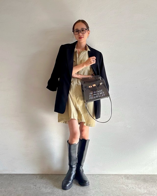 最後にご紹介するのは、テーラードジャケット×ミニ丈のコーデ。「40代でミニ丈なんて……」と躊躇する方もいるかもしれませんが、ジャケットが大人感を作ってくれるので意外としっくりくるんです。