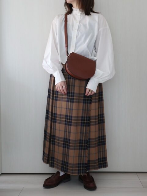 シューズならブーツ、ローファー、スニーカーがおすすめ。バッグはボストンのほか、三日月や半月形、ワンハンドルなどを選ぶとトレンドと使いやすさを両立できます。いずれもスエードやファー・ボア素材を選ぶことで、季節感と今っぽいクラシカルさを添えられます。
