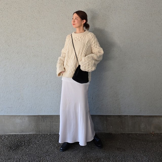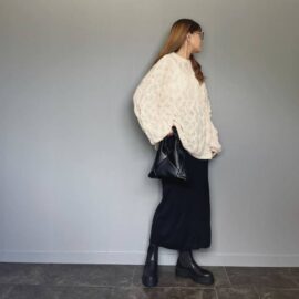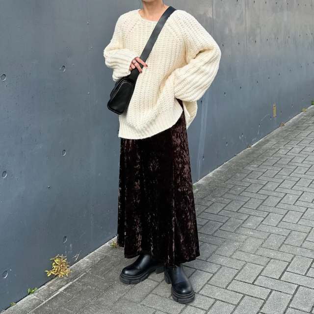 大きめニットに「マーメイドスカート」は合わせにくいイメージですが、ロング丈なら心配なし。丈感が長いことでスカートのカーヴィーラインが控えめとなり、シルエットがスッキリ見えます。一方、大きめニットを合わせることで、レディライクなマーメイドスカートをカジュアルに着こなせるメリットもあり。