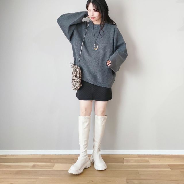大きめニットだからこそ合わせてみてほしいのが「ミニ丈の台形スカート」です。ダボッとしたニットが短めスカートを程よく隠して、お尻まわりをカバー。台形ミニスカートが甘くなりすぎず、普段使いしやすくなりますよ。