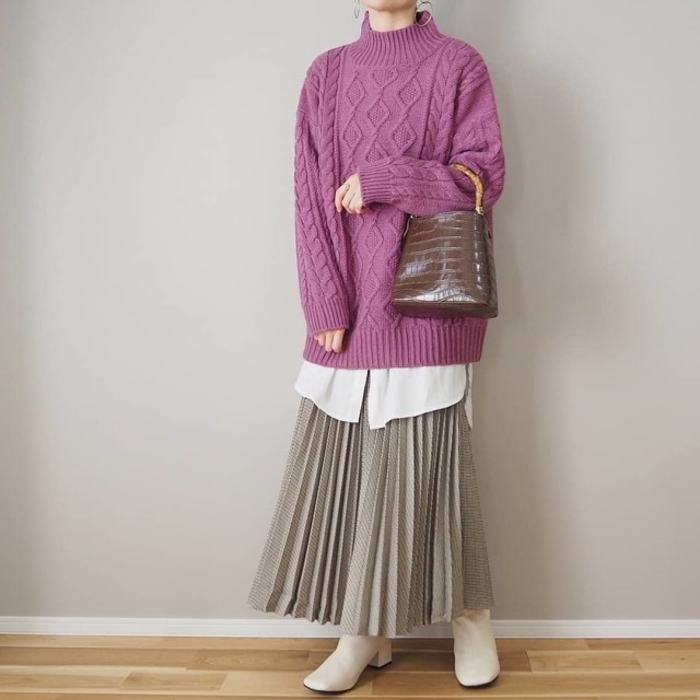 「ロング丈のプリーツスカート」は大きめニットと相性バツグン。凹凸(おうとつ)のあるヒダが立体的なシルエットを作るため、コーデがのっぺり見えません。またオーバーサイズニットはラフになりがちですが、きちんと感のあるプリーツスカートと合わせることできれいめな装いに。
