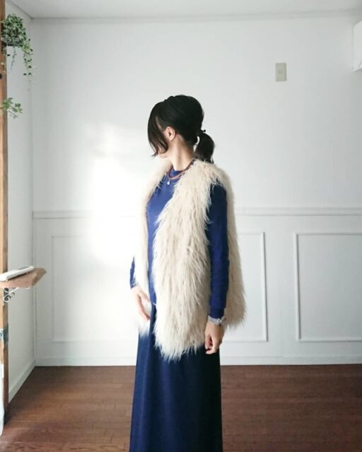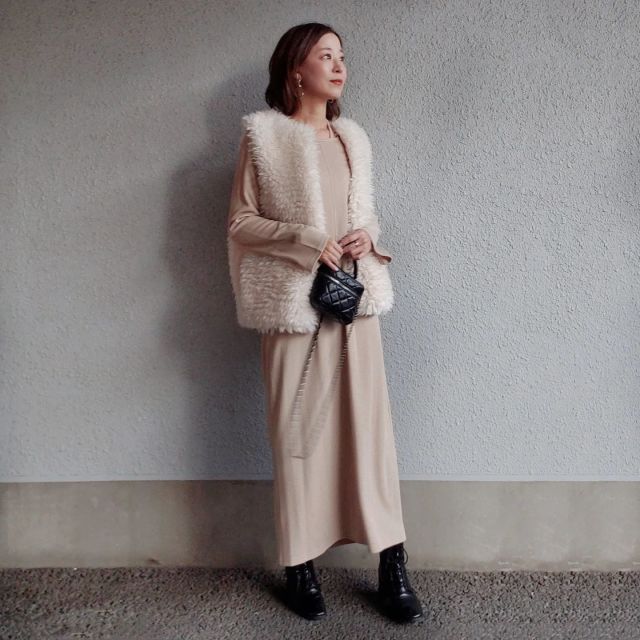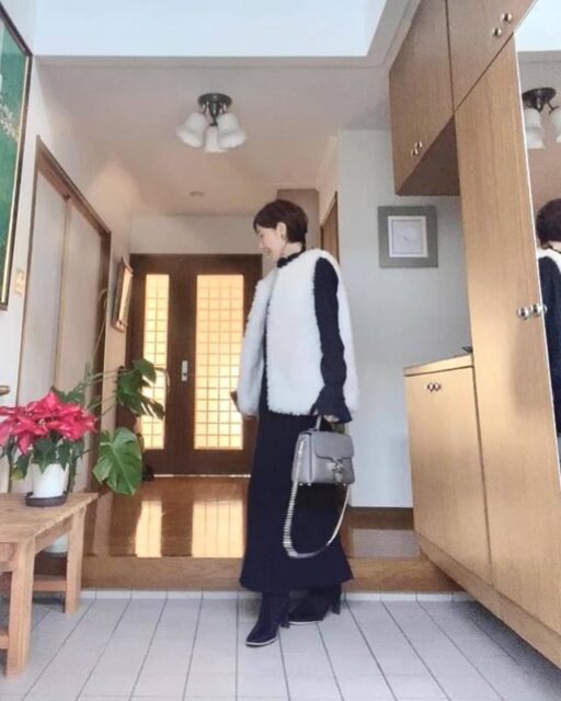 サッと羽織るだけでコーデが華やぐ「白のファーベスト」は40代50代にぴったりな一枚。基本色のトップスやワンピースに羽織れば派手見えせず取り入れやすいですよ。
