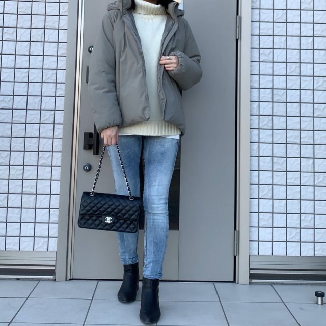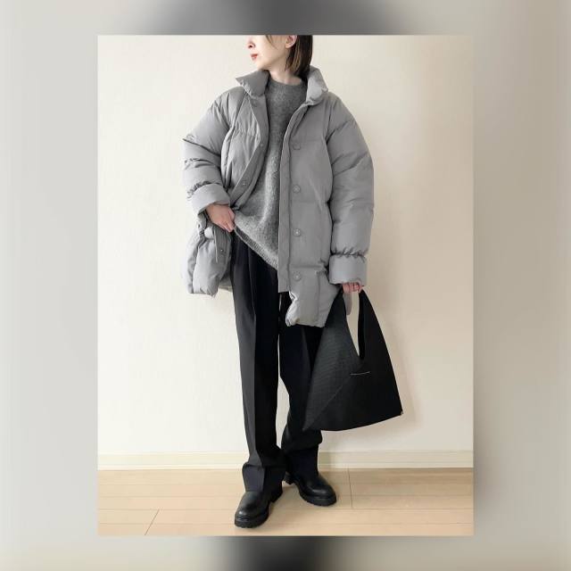 まずご紹介するのは、グレーダウンのインナーにホワイトニットを取り入れたコーデ。グレー×ホワイトの配色は清潔感たっぷりで顔映えを明るくしてくれます。カジュアルなダウンをクリーンに着こなしたい日にぴったり!