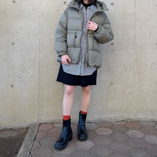 最後にご紹介するのは、グレーダウンにストライプシャツと赤いソックスをプラスしたカジュアルスタイル。柄モノを一点投入すると、ベーシックなグレーダウンコーデの奥行きが簡単にアップできます。またアクセントになる色をほんの少し加えるだけでも、おしゃれに見えるあか抜け配色が完成!