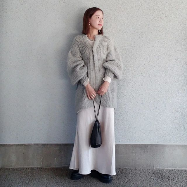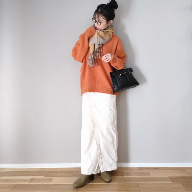 ボリューミーなニットは白スカートと相性バツグン。清潔感たっぷりなスカートがダボッとしたニットを引き締めきれいめな装いに。ダラしなく見えそうな大きめニットを品よく着こなせます。