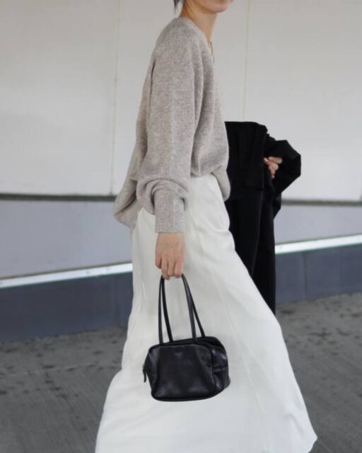 白スカートを着るときにイチ押しなのが、基本色ニットとの着合わせ。というのもベージュ・黒・グレーやカーキなど定番色のニットは沈んだ印象になりがちですが、白いスカートに合わせれば問題なし。コーデが瞬時に映えて、クリーンなルックスに決まります。