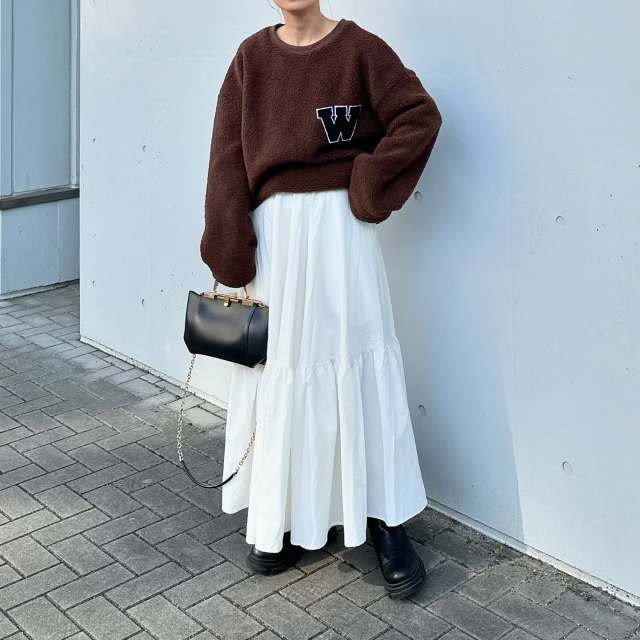 ボリュームニットに同じくボリュームがあるスカートの着合わせは難しそうに感じますよね。しかし軽やかに見える白いスカートを選べば、むしろ抜け感たっぷりのスタイルに。カジュアルでこなれた印象に仕上げたい日は、ぜひこの組み合わせを試してみてください。