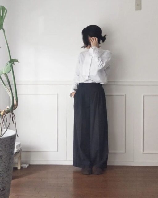 黒やネイビーなどダークカラーのワイドパンツを穿くときにうってつけなのが「白シャツ」。コーデの色対比が強くなるためメリハリが出て、スッキリとした着こなしに。デザイン性の高い白シャツを選べばモードに決まります。