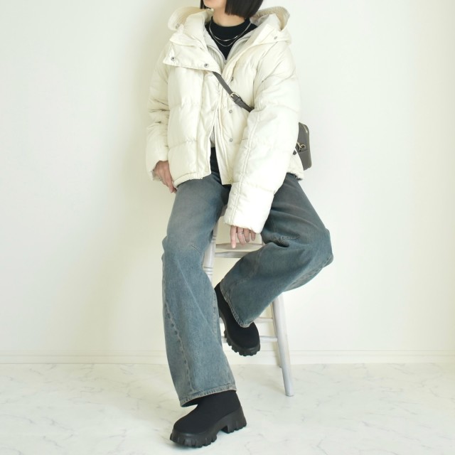 最後にご提案するのは、デニムパンツの色にこだわる着こなしアイデア。例えばスナップでは、白っぽく淡いライトブルーデニムパンツを定番の黒ダウンに合わせて。淡いカラーのデニムが冬のボリューミーなダウンコーデを軽やかにしてくれます。