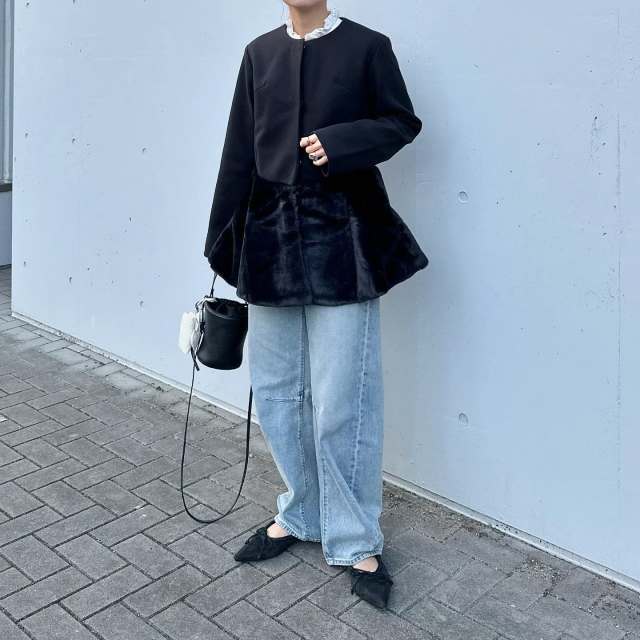 【40代の黒コートコーデ3】ライトブルーのデニムパンツを合わせる